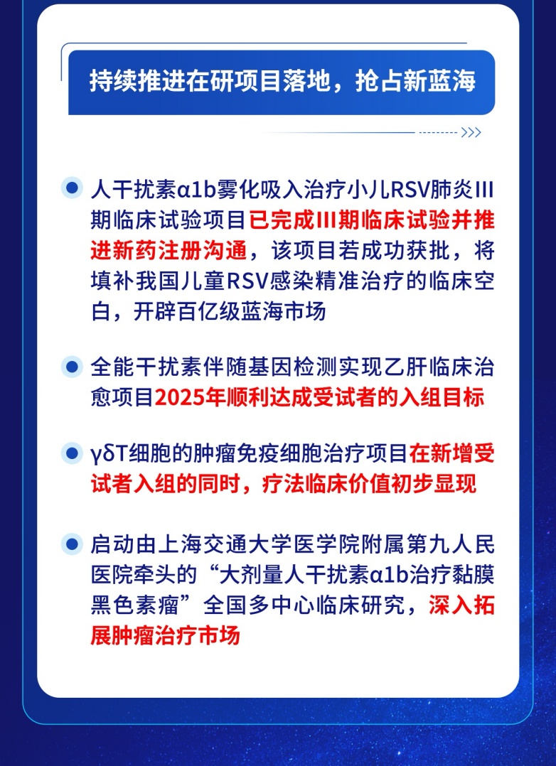 產(chǎn)品創(chuàng)新方面,三元基因人干擾素α1b霧化吸入治療小兒RSV肺炎Ⅲ期臨床試驗(yàn)項(xiàng)目已完成Ⅲ期臨床試驗(yàn)并推進(jìn)新藥注冊溝通。全能干擾素伴隨基因檢測實(shí)現(xiàn)乙肝臨床治愈項(xiàng)目2025年順利達(dá)成受試者的入組目標(biāo);γδT細(xì)胞的腫瘤免疫細(xì)胞治療項(xiàng)目在新增受試者入組的同時(shí),療法臨床價(jià)值初步顯現(xiàn)。此外,公司啟動由上海交通大學(xué)醫(yī)學(xué)院附屬第九人民醫(yī)院牽頭的“大劑量人干擾素α1b治療黏膜黑色素瘤”全國多中心臨床研究,深入拓展腫瘤治療市場。