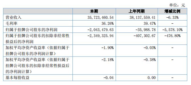 報(bào)告期內(nèi),公司實(shí)現(xiàn)營(yíng)業(yè)收入35,723,460.54元,較上年同期38,137,559.41元減少了6.33%;實(shí)現(xiàn)利潤(rùn)總額-1,990,676.54元,凈利潤(rùn)-2,043,479.63元,分別較上年同期減少了13,180.31%和5,578.10%(其中,母公司實(shí)現(xiàn)營(yíng)業(yè)收入34,536,694.34元,實(shí)現(xiàn)凈利潤(rùn)-1,898,832.26元)。公司營(yíng)業(yè)利潤(rùn)減少主要由于產(chǎn)品毛利較去年同期減少2,100,326.59元。?