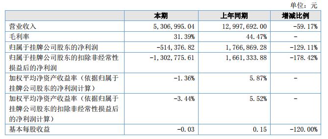 報告期內(nèi),公司實現(xiàn)營業(yè)收入5,306,995.04元,較去年同期減少59.17%;實現(xiàn)凈利潤為-514,376.82元,較去年同期減少129.11%。本報告期末,公司總資產(chǎn)為60,737,140.82元,凈資產(chǎn)為37,610,663.30元。?