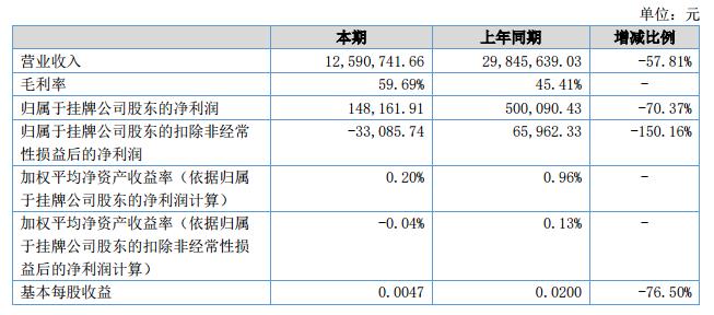 報(bào)告期內(nèi),公司營業(yè)收入為12,590,741.66元,與上年同期29,845,639.03元相比,減少了17,254,897.37元,下降了57.81%;營業(yè)成本為5,075,842.26元,比去年同期減少了11,217,353.36元,下降了68.85%;公司凈利潤(rùn)為148,161.91元,與去年同期相比,減少了351,928.52元,下降了70.37%;整體毛利率為59.69%,較上年同期的45.41%有明顯上升。