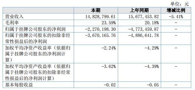 報告期內(nèi),公司營業(yè)收入14,828,799.61元,較上年同期的15,677,453.82元減少848,654.21元,降幅5.41%;公司凈利潤為虧損2,270,198.30元,較上年同期虧損4,773,459.87元減少虧損2,503,261.57元,變?