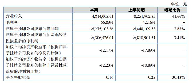 報告期內實現(xiàn)銷售收入4,814,003.61元,比去年同期8,251,902.85元減少3,437,899.24元,較去年同期減少41.66%;營業(yè)成本1,591,010.17元,比去年同期4,772,699.30元減少3,181,689.13元,較去年同期減少66.66%;?實現(xiàn)凈利潤-6,275,103.26元,比去年同期凈利潤-6,448,109.53元增加173,006.27元,較去同期增加2.68%。?