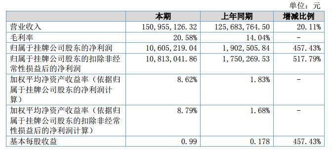 報(bào)告期內(nèi),公司實(shí)現(xiàn)營業(yè)收入150,955,126.32元,較上年同期比增長20.11%;歸屬于掛牌公司股東的凈利潤10,605,219.04元,較上年同比增長457.43%,毛利率20.58%,比上一年度大幅提高。?