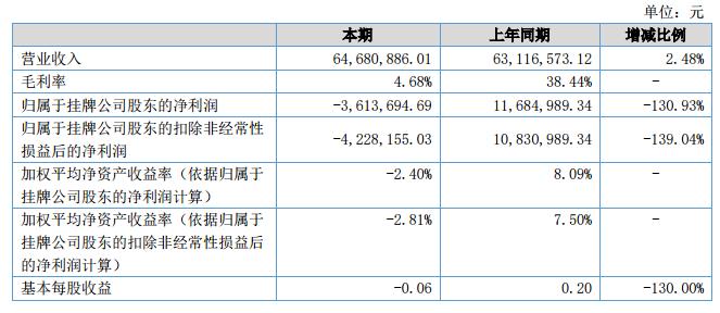 報告期內(nèi),公司實現(xiàn)營業(yè)收入64,680,886.01,較上期增長2.48%;公司實現(xiàn)扣除非經(jīng)常性損益后的凈利潤-4,228,155.03元,較上期減少139.04%。?
