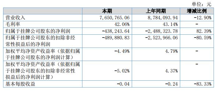 報(bào)告期內(nèi)實(shí)現(xiàn)營業(yè)收入7,650,765.06元,較去年同期營業(yè)收入8,784,093.94元,下降1,133,328.88元,歸屬于掛牌公司凈利潤-438,243.64元,相比去年凈利潤-2,488,323.79元減少2,050,080.15元,經(jīng)營活動(dòng)產(chǎn)生的現(xiàn)金流量凈額為-2,309,556.75元。?