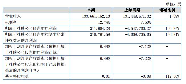 報告期內(nèi),公司實現(xiàn)營業(yè)收入13,366.12萬元,同比增長1.68%;實現(xiàn)凈利潤31.11萬元,同比增長106.84%;經(jīng)營活動產(chǎn)生的現(xiàn)金流量凈流出為185.69萬元,凈流出減少24.01%;截止報告期末,公司總資產(chǎn)、凈資產(chǎn)分別為13,308.47萬元、6,754.41萬元,較上年同期分別增長2.37%、0.48%。?