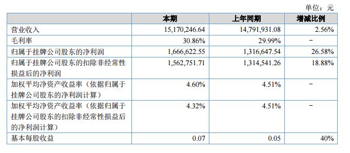 報告期內(nèi),營業(yè)收入15,170,246.64元,較上年同期增加378,315.56元,同比增加2.56%;凈利潤1,666,622.55元,較上年同期增加349,975.01元,同比增加26.58%。?