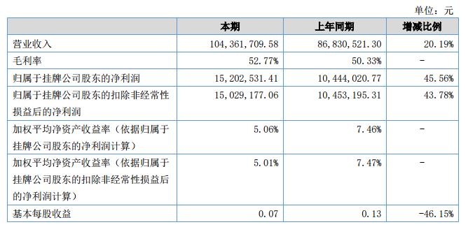 報告期內,公司實現(xiàn)營業(yè)收入10,436.17萬元,較上年同期增長20.19%,主要原因為:本期公司拓寬了銷售渠道,使公司產品銷售較上年同期有大幅增長,本期公司實現(xiàn)凈利潤1,520.25萬元,較上年同期增長了45.56%;本期毛利率為52.77%,較去年同期無較大變化。?