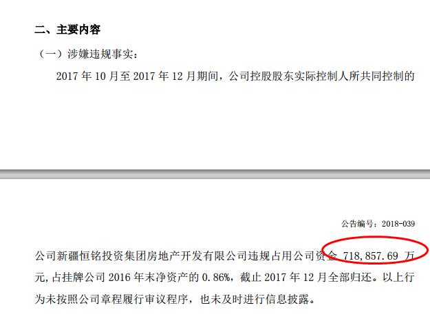 據(jù)介紹,2017年10月至2017年12月期間,公司控股股東實(shí)際控制人所共同控制的公司新疆恒銘投資集團(tuán)房地產(chǎn)開發(fā)有限公司違規(guī)占用公司資金718,857.69元,占掛牌公司 2016 年末凈資產(chǎn)的 0.86%,截止 2017 年 12 月全部歸還。以上行為未按照公司章程履行審議程序,也未及時(shí)進(jìn)行信息披露。