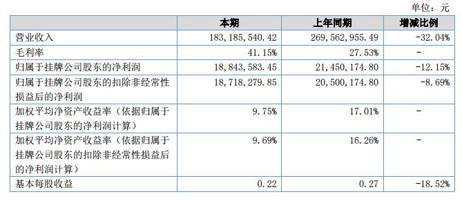 報(bào)告期內(nèi),醇醚汽油產(chǎn)品銷售收入達(dá)到121,083,268.43元,較去年同期增長69.76%;其他化工原料產(chǎn)品銷售收入壓縮至22,147,756.49元,較去年同期下降83.22%;醇醚柴油產(chǎn)品受市場行情波動(dòng)影響,上半年銷售收入為39,954,515.5元,較去年同期下降39.67%。受此影響,2018年上半年公司實(shí)現(xiàn)營業(yè)收入183,185,540.42元,較去年同期下降32.04%;毛利率41.15%,較去年同期增長13.62個(gè)百分點(diǎn);歸屬于掛牌公司股東的凈利潤18,843,583.45元,較去年同期下降12.15%。?