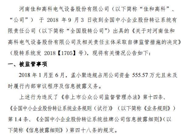 挖貝網(wǎng) 9月4日消息,新三板掛牌企業(yè)佳和高科(838149)董事長孟小聚違規(guī)占用資金555.57 萬元,未及時履行內(nèi)部審議程序和信息披露,被全國股轉(zhuǎn)公司出具警示函。