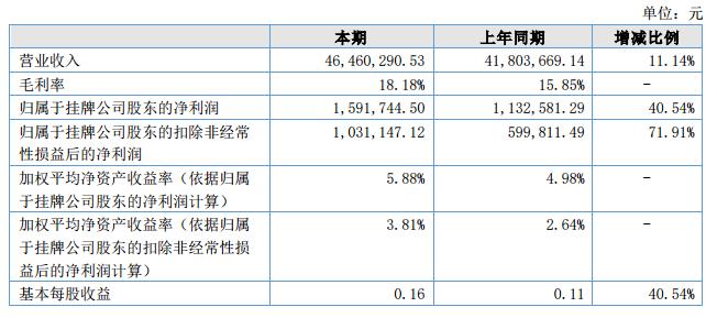 報告期內(nèi),公司實現(xiàn)營業(yè)收入4,646.03萬元,較上年同期4,180.37萬元,增加465.66萬元,同比增加11.14%;實現(xiàn)歸屬于母公司所有者的凈利潤159.17萬元,較上年同期113.26萬元,增加45.92萬元,同比增加40.54%。?