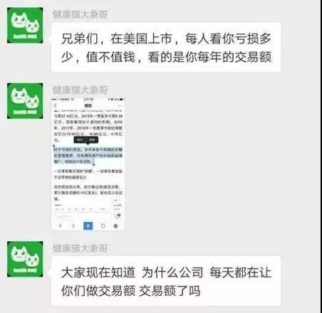 據(jù)有關(guān)人員提供的微信截圖,大象科技在微信朋友圈號(hào)召刷單,而且又打著“早日去美國上市”的旗號(hào)。據(jù)媒體報(bào)道,最后吸引了25萬名私教在健康貓app平臺(tái)上。
