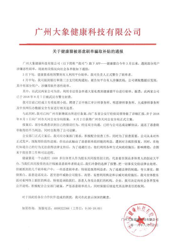 8月20日,大象科技在官方微博上中貼出一則《關(guān)于健康貓被惡意刷單騙取補(bǔ)貼的通報(bào)》,通告稱,以武漢兩家公司為首,平臺(tái)上的注冊(cè)私教“惡意刷單”涉嫌詐騙,并以此為由公開聲明停止提現(xiàn)。