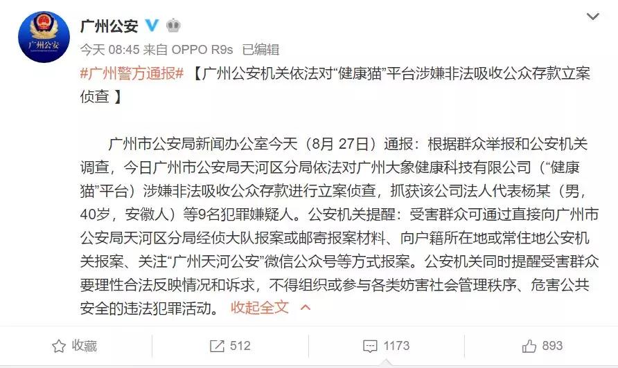 8月27日,廣州公安官方發(fā)布微博稱,對(duì)健康貓平臺(tái)運(yùn)營方廣州大象健康科技有限公司涉嫌非法吸收公眾存款進(jìn)行立案偵查,抓獲該公司法定代表人楊某等9名犯罪嫌疑人。