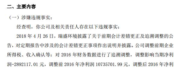 據(jù)全國股轉公司披露,經(jīng)查明,2018年4月26日瑞盛環(huán)境披露了關于前期會計差錯更正及追溯調整的公告,將2015-2016年的利潤各調低了150萬和289萬,并調整前期企業(yè)所得稅、收入確認等。