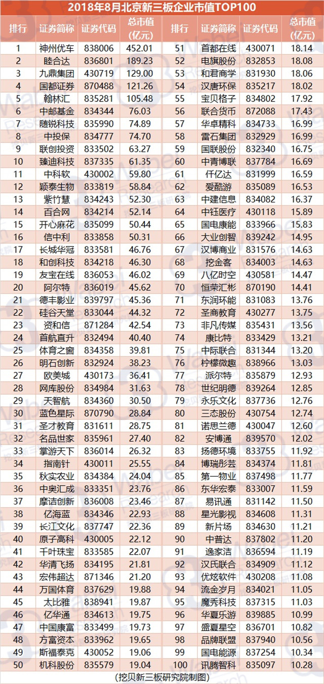 附:2018年8月北京新三板企業(yè)市值TOP100
