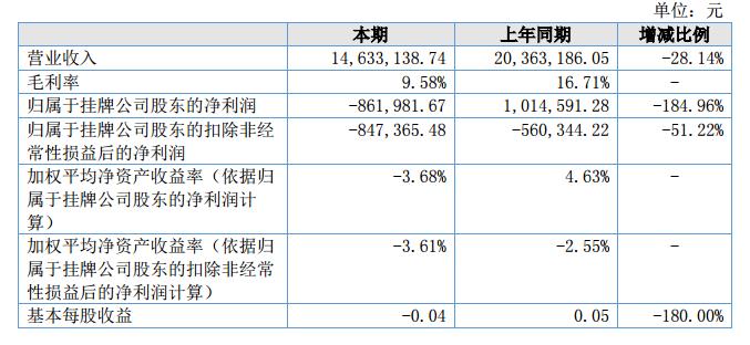報(bào)告期內(nèi)公司實(shí)現(xiàn)營(yíng)業(yè)收入1,463.31萬元,營(yíng)業(yè)成本1,323.15萬元,較上期營(yíng)業(yè)成本減少了372.95萬元,減少比例為21.99%,凈利潤(rùn)-86.20萬元,較上期凈利潤(rùn)101.46萬元減少了187.66萬元,減少比例為184.96%。