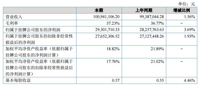 報(bào)告期內(nèi),公司實(shí)現(xiàn)營(yíng)業(yè)收入100,941,106.20元,較上年同期99,387,044.28元增長(zhǎng)1.56%;營(yíng)業(yè)成本63,363,626.29元,較上年同期62,844,287.72元增加0.83%;實(shí)現(xiàn)歸屬于掛牌公司股東的凈利潤(rùn)29,301,710.33元,較上年同期28,257,763.63元增長(zhǎng)3.69%;經(jīng)營(yíng)活動(dòng)現(xiàn)金流量?jī)纛~3,275.85萬(wàn)元,較上年同期2,111.35萬(wàn)元增加55.15%。?