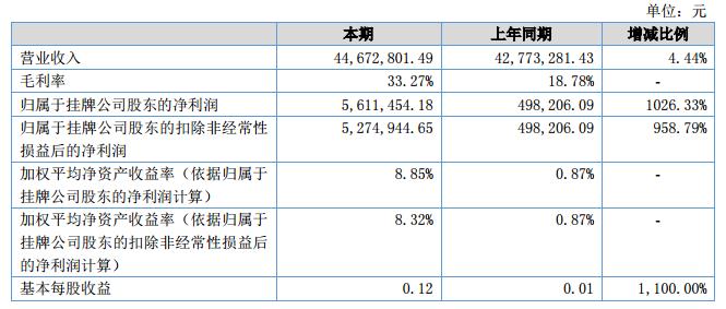 截至本期末公司資產(chǎn)總額為83,446,765.82元,較期初88,409,936.95元下降5.61%。公司本期實現(xiàn)營業(yè)收入44,672,801.49元,實現(xiàn)利潤5,611,454.18元,較上期增長1026.33%。報告期內(nèi)公司加大非標產(chǎn)品的投入力度,提升公司總體毛利率,提升管理水平控制費用支出,實現(xiàn)利潤的大幅提升。?