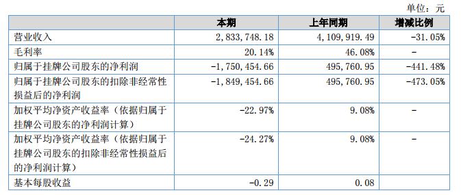 報告期內(nèi),公司實現(xiàn)營業(yè)收入2,833,748.18元,較上年同期下降31.05%,報告期內(nèi),凈利潤為-1,750,454.66元,較上年同期下降453.08%。?