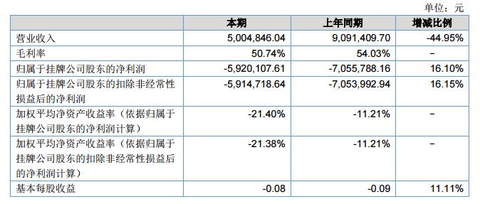 報(bào)告期內(nèi),公司實(shí)現(xiàn)營(yíng)業(yè)收入約為500.48萬(wàn)元,較上年同期減少408.66萬(wàn)元,同比降低44.95%,歸屬于公司股東的凈利潤(rùn)約為-592.01萬(wàn)元,較上年同期少虧損113.57萬(wàn)元,同比增長(zhǎng)16.10%。