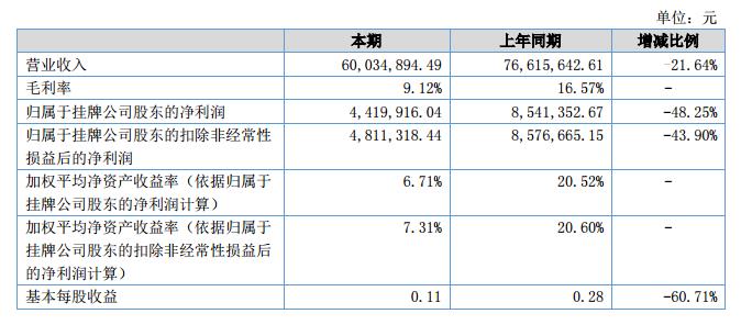 報告期內(nèi),公司共實現(xiàn)營業(yè)收入60,034,894.49,較2017年上半年減少21.64%;毛利率為9.12%,較上期下降7.45%,較上年全年下降2%;公司2018年上半年合并凈利潤為4,419,916.04元,與去年同期相比,下降48.25%。?