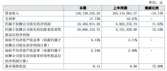 報告期內(nèi)公司實現(xiàn)營業(yè)收入148,138,245.28元,較上年同期減少19.11%;凈利潤10,405,874.59元,上年同期增長71.62%;主營產(chǎn)品毛利率由10.67%提高到17.73%。?