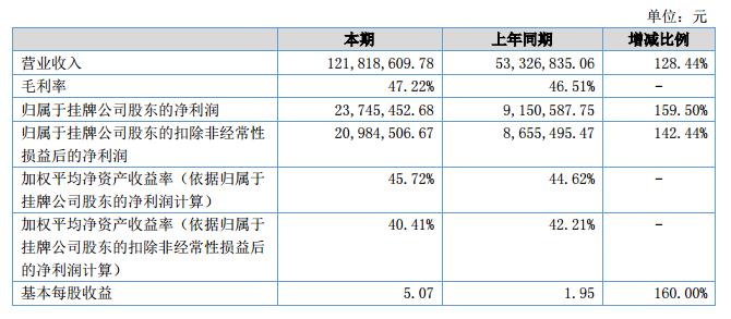 報告期內,公司實現(xiàn)營業(yè)收入121,818,609.78元,同比增長128.44%;報告期內,公司實現(xiàn)凈利潤23,745,452.68元,同比增長159.50%。