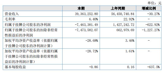 報(bào)告期內(nèi),公司的營業(yè)收入為39,363,252.80元,較去年同期減少17,087,488.04元,增長(zhǎng)比例為-30.27%;歸屬掛牌公司股東的凈利潤為-7,463,381.49元,較去年同期1,427,242.72元,下降了622.92%。?