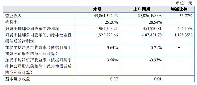 報告期內,公司實現(xiàn)主營業(yè)務收入4,586.45萬元,與去年同期相比增長53.77%;營業(yè)成本3,430.72萬元,與去年同期相比增長60.95%;實現(xiàn)歸屬于股東的凈利潤196.13萬元,與去年同期相比增長454.15%。?