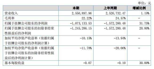 報(bào)告期內(nèi),公司實(shí)現(xiàn)收入2,556,897.96元,較上年同期增長(zhǎng)1.19%,營業(yè)收入增長(zhǎng)的主要原因是加大了市場(chǎng)拓展的力度和新產(chǎn)品開發(fā)的速度,產(chǎn)品訂單略有增加。凈利潤-1,073,133.53元,較去年同期增加31.75%。主要得益于成本費(fèi)用的有效控制。?