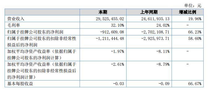 公司實現(xiàn)營業(yè)收入2,952.55萬元,同比上升19.96%,公司實現(xiàn)凈利潤-90.99萬元,同比上升66.30%,報告期內(nèi)公司利潤上升179.03萬元。?