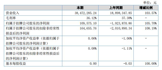 報告期內(nèi)公司營業(yè)收入達到38,472,285.24元,較2017年度同期增長103.57%;凈利潤實現(xiàn)109,575.10元,較2017年度同期增長105.70%。?