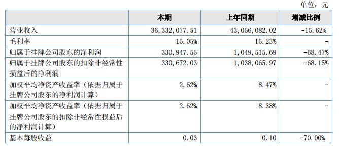 報告期內(nèi)公司實現(xiàn)營收3,633.21萬元,同比減少15.62%;公司實現(xiàn)歸屬于掛牌股東的凈利潤32.74萬元,同比減少67.65%。?