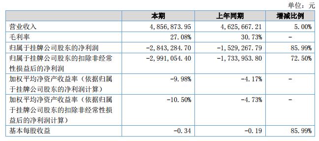 報告期內(nèi),公司經(jīng)營業(yè)績平穩(wěn)增長,營業(yè)收入485.69萬元,較去年同期增長5%;營業(yè)成本842.20萬元,較去年同期增長27.53%;歸屬于掛牌公司股東的凈利潤虧損284.43萬元。?