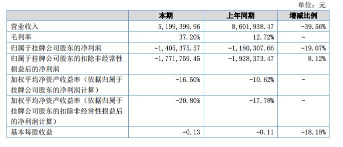 報(bào)告期內(nèi),公司實(shí)現(xiàn)營(yíng)業(yè)收入 519.94 萬元,比上年同期下降 39.56%;業(yè)務(wù)成本 709.97 萬元,比上 年同期下降 32.33%;實(shí)現(xiàn)歸屬于掛牌公司股東的凈利潤(rùn)-140.54 萬元,比上年同期下降 19.07%。經(jīng)營(yíng)活 動(dòng)產(chǎn)生的現(xiàn)金流量?jī)纛~-56.86 萬元,較上年同期增加 181.18 萬元。?