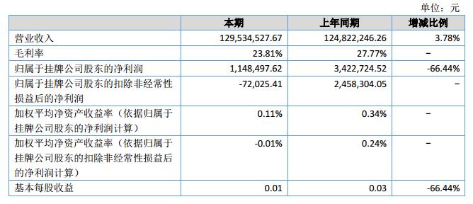 報告期內(nèi)公司實現(xiàn)營業(yè)收入129534527.67元,比2017年同期增加3.78%;實現(xiàn)凈利潤1148497.62元,比2017年同期減少66.44%。?