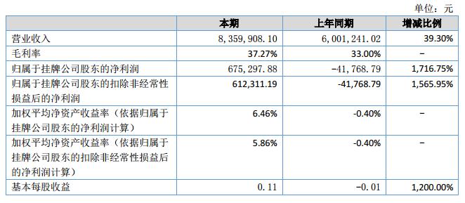 報告期內(nèi),公司實(shí)現(xiàn)營業(yè)收入8,359,908.10元,較上年同期增長39.30%。凈利潤為675,297.88元,較去年同期增長1716.75%。?