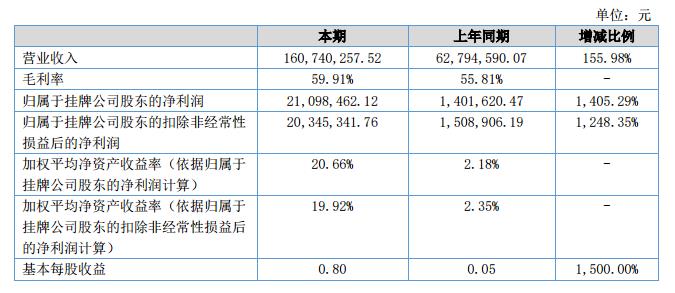 報(bào)告期內(nèi),公司業(yè)績(jī)經(jīng)歷了爆發(fā)式的增長(zhǎng),實(shí)現(xiàn)營(yíng)業(yè)收入16,074.03萬(wàn)元,同比增長(zhǎng)155.98%;凈利潤(rùn)2,188.04萬(wàn)元,同比增長(zhǎng)1970.44%。?