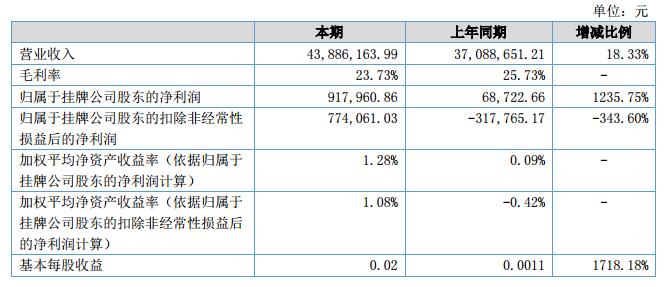 報告期內(nèi)公司營業(yè)務收入為43,886,163.99元,同期增長18.33%;營業(yè)成本為33,472,973.28元,同期增漲21.52%;歸屬于母公司的凈利潤為917,960.86元,同期增漲1235.75%。