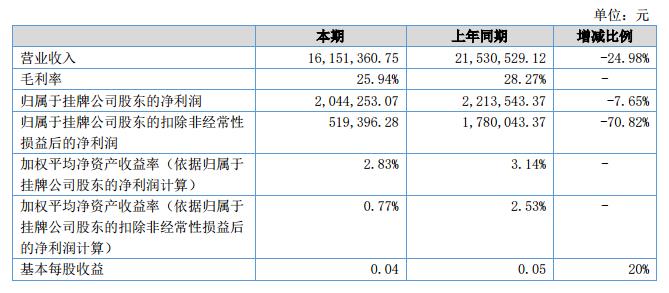 報告期內(nèi),公司實現(xiàn)營業(yè)總收入16,151,360.75元,同比下降5,379,168.37元,下降幅度24.98%,其中機械類營業(yè)收入10,928,449.31元,相比去年減少4,048,106.11元;冷鏈類營業(yè)收入5,209,334.61元,相比去年減少1,344,639.06元。營業(yè)總成本15,441,684.76元,同比下降4,129,769.02元,下降幅度21.10%。凈利潤2,044,253.07元,同比下降169,290.30元,下降比例7.65%。經(jīng)營活動產(chǎn)生的現(xiàn)金流量凈額-1,594,818.53元,同比下降4,030,512.06元,下降比例165.48%。?