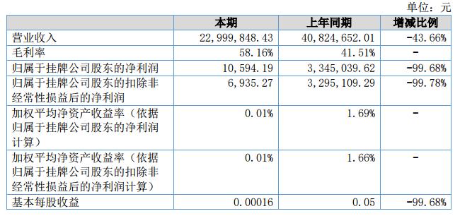 報(bào)告期內(nèi)營(yíng)業(yè)收入22,999,848.43元,較上年同期40,824,652.01元,下降了43.66%;營(yíng)業(yè)成本23,358,283.48元,較上年同期38,469,896.48元,下降了39.28%;歸屬于掛牌公司股東的凈利潤(rùn)為10,594.19元,較上年同期3,345,039.62元,下降了99.68%。?