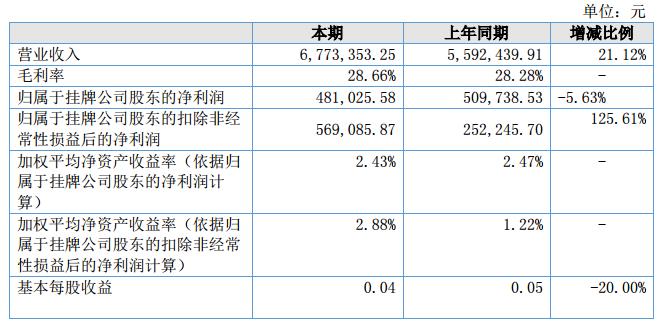 報(bào)告期內(nèi)公司營業(yè)收入677.33萬元,較上期同比增加21.12%;報(bào)告期內(nèi)公司凈利潤為42.74萬元,較上期減少5.89%。?