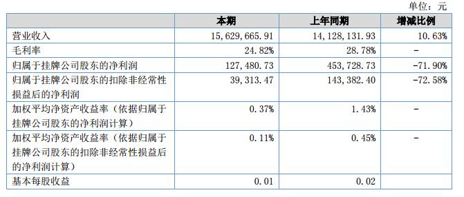 報(bào)告期內(nèi),公司營(yíng)業(yè)收入15,629,665.91元,較去年同期上升10.63%。收入上升主要是因?yàn)楸酒陧?xiàng)目完工收入比上年同期增加。凈利潤(rùn)本期為127,480.73元,上年同期為453,728.73元。利潤(rùn)減少主要是因?yàn)楸酒谑杖肫骄实陀谏夏晖凇?