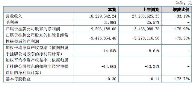 報(bào)告期內(nèi)公司實(shí)現(xiàn)營業(yè)收入18,229,542.24元,較上年同期減少33.19%;實(shí)現(xiàn)歸屬于掛牌公司股東的凈利潤-9,593,188.08元,較上年同期減少178.95%。?