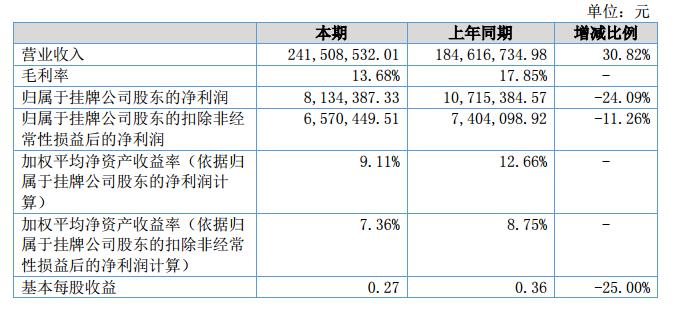 報(bào)告期內(nèi),公司實(shí)現(xiàn)營(yíng)業(yè)收入241,508,532.01元,比上年同期增長(zhǎng)30.82%;營(yíng)業(yè)成本為208,466,242.45元,比上年同期增長(zhǎng)37.46%;凈利潤(rùn)為8,134,387.33元,比上年同期減少24.09%。?