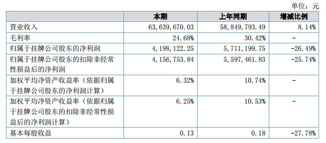 報(bào)告期內(nèi)公司實(shí)現(xiàn)營(yíng)業(yè)收入6,363.97萬(wàn)元,同比增長(zhǎng)8.14%;利潤(rùn)總額為448.42萬(wàn)元,實(shí)現(xiàn)凈利潤(rùn)419.81萬(wàn)元。?