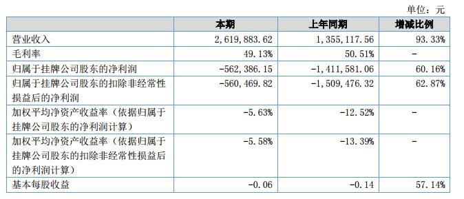 報告期內(nèi)公司實現(xiàn)營業(yè)收入2,619,883.62元,相比上年同期增長93.33%;歸屬于掛牌公司股東的凈利潤-562,386.15,相比上年同期增加60.16%。?