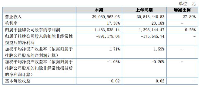 報(bào)告期內(nèi),公司的經(jīng)營狀況繼續(xù)穩(wěn)步發(fā)展,上半年實(shí)現(xiàn)營業(yè)收入39,060,962.95元,與上年同期相比增長(zhǎng)27.89%;扣除非經(jīng)常性損益后的凈利潤-891179.04元,與上年同期相比減少715533.3元。?